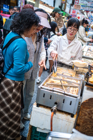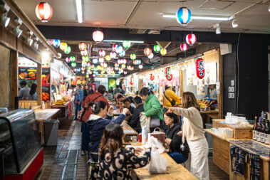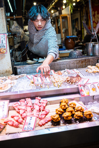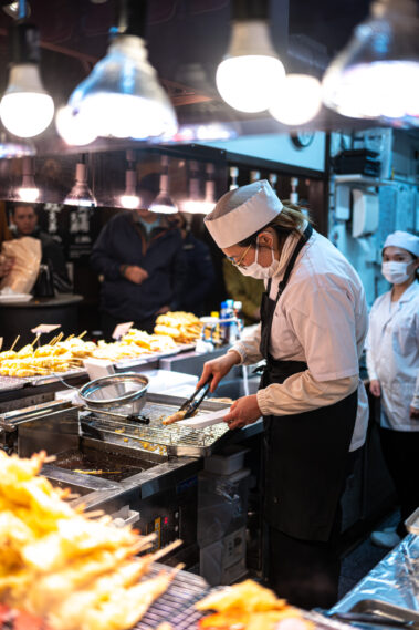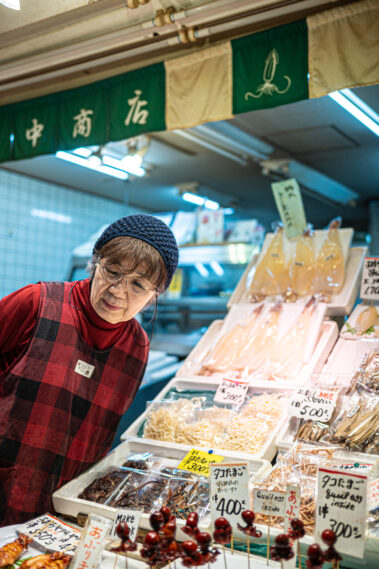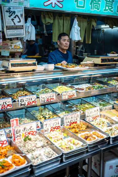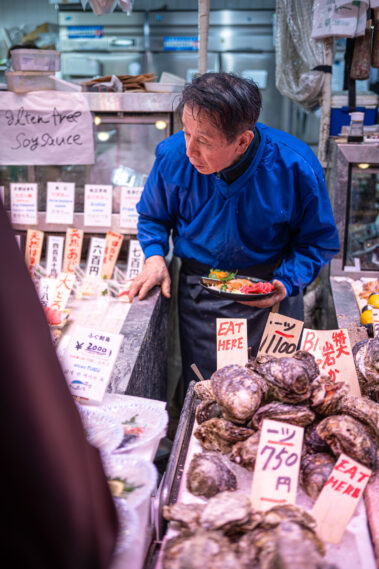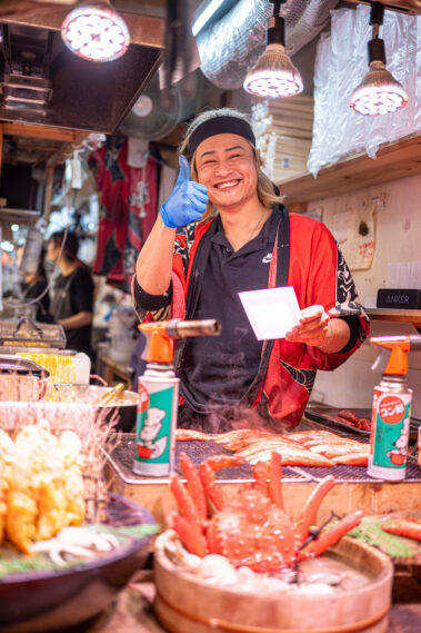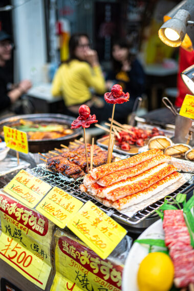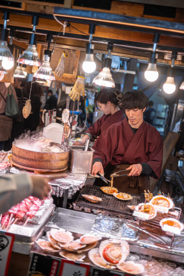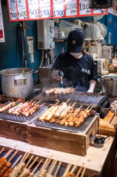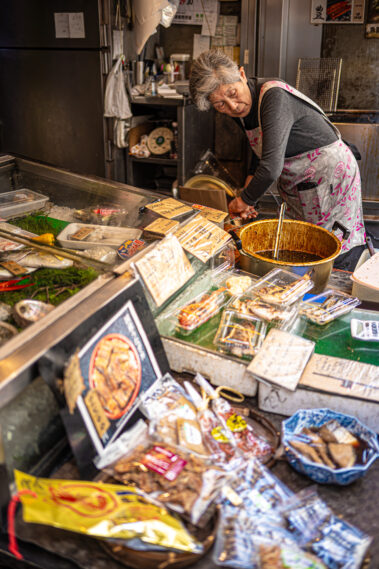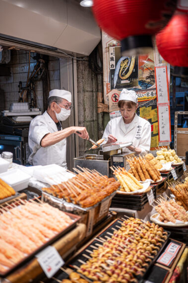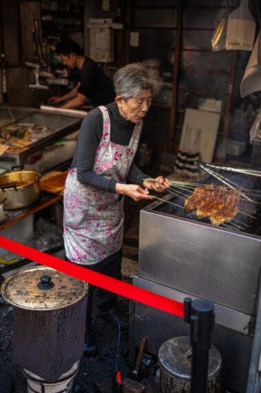 Mitten im morgendlichen Trubel eines japanischen Streetfood-Marktes: Der Duft von gegrilltem Fisch liegt in der Luft, dampfende Spieße reihen sich wie Kunstwerke auf, und jedes Gesicht hinter dem Tresen erzählt eine Geschichte.