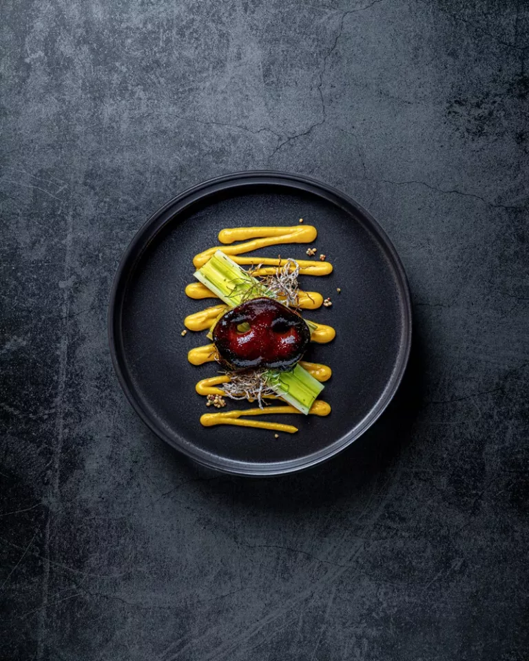 Zweiter Gang: „Schnauze du Lauch“ – Lackierte Duroc-Schnauze mit fermentiertem Lauch, Kürbispüree und frittierten Lauchwurzeln